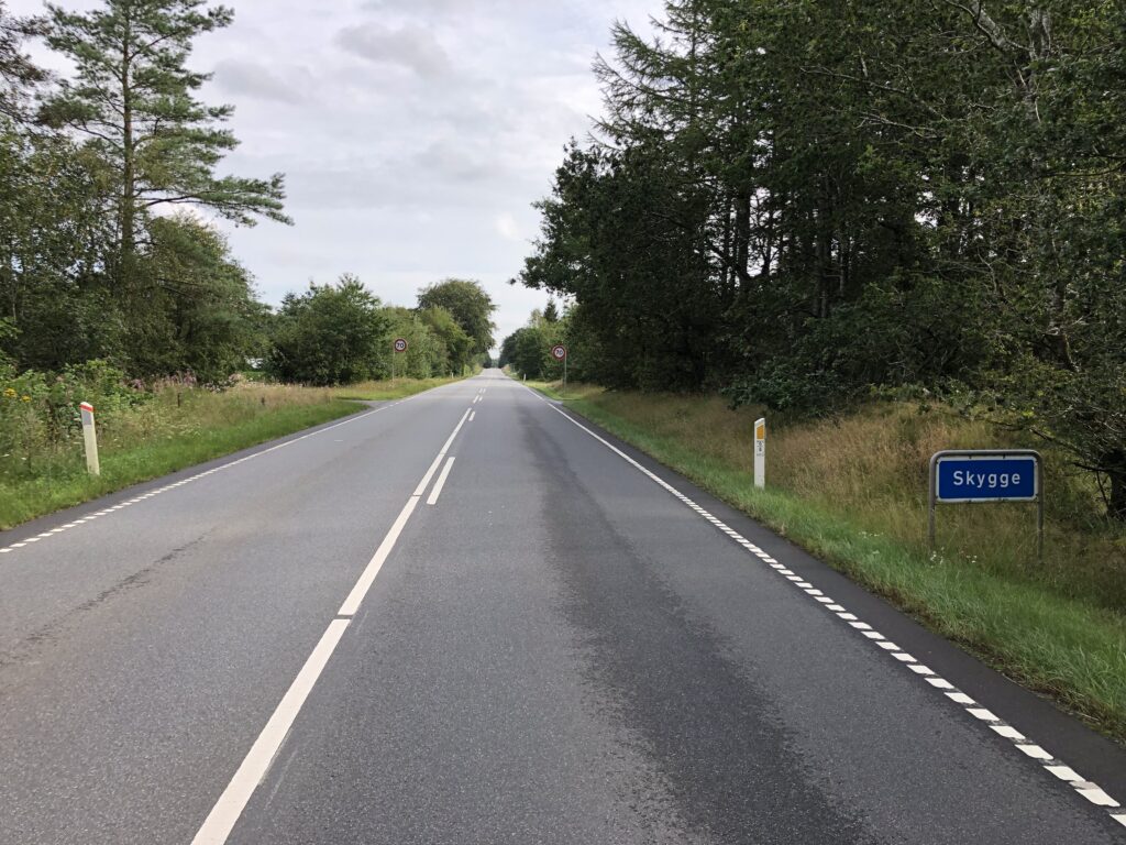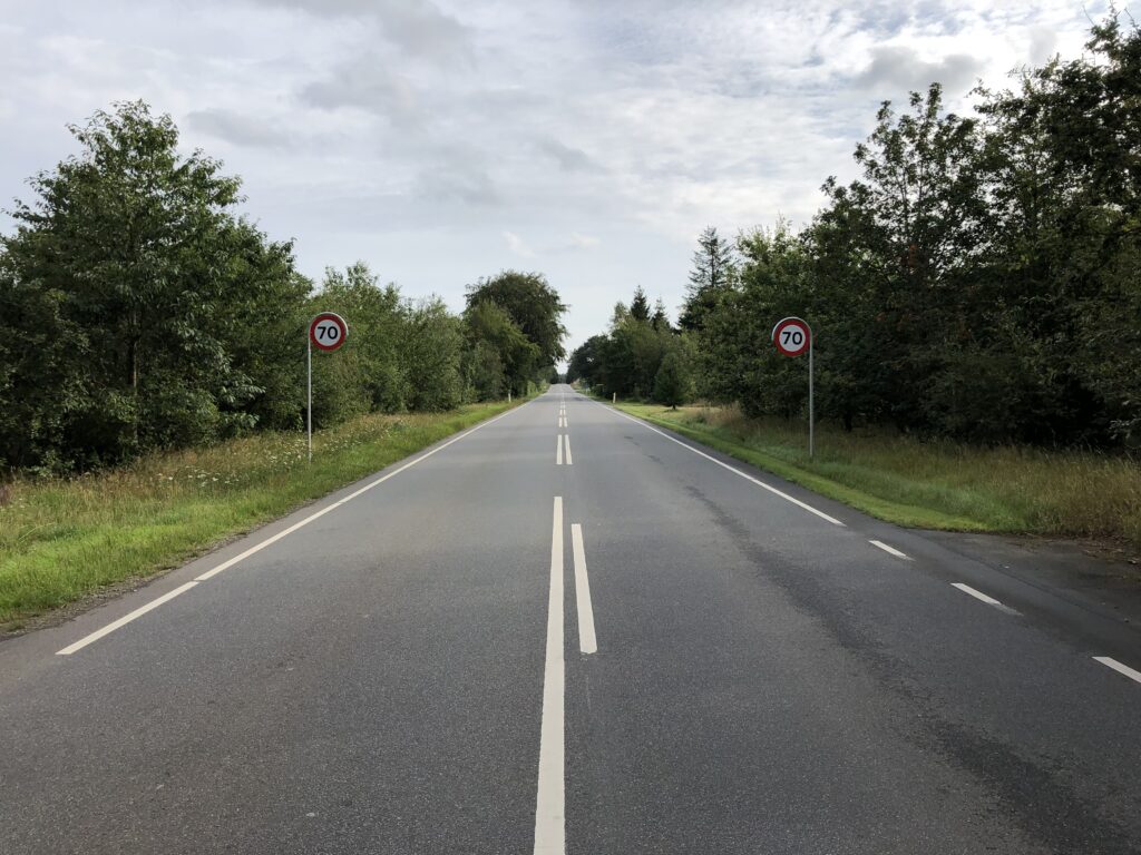 Bemærk venligst, at der absolut intet sker med vejens eller kørebanens udformning i øvrigt. Absolut intet. Ikke en Skygge af ændringer. Ingen synlige risikoelementer. Måske ligger landbetjent Hansen i ly af skoven længere fremme med sit 4k kamera og en enorm velpolstret blanketblok med standardformularer for en fartbøde som et risikomoment. Men han tager måske kun den første på den dag, hvor han står der. Resten er advaret med Saphe og Ono (dette er ikke en reklame!!!).