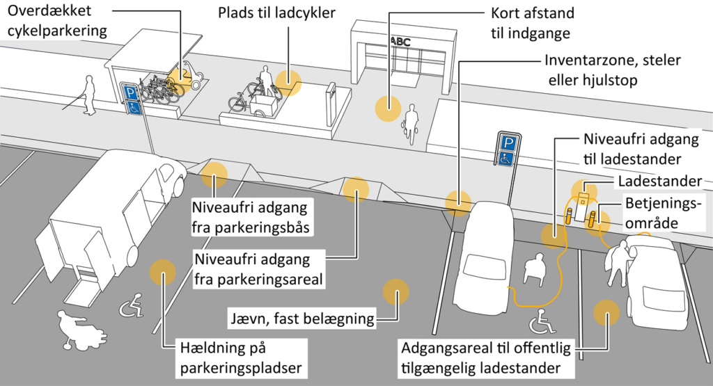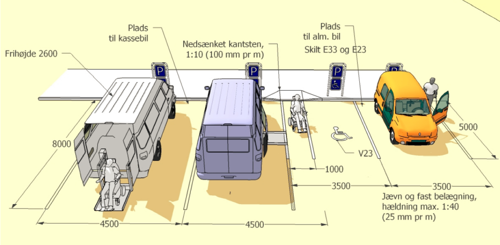Men bygger vi sådan, som i nogensinde? Bygger vi seriøst bus handicap-pladser ud i et gennemgående manøvreplads/fordelingsspor på et parkeringsareal? Jeg har aldrig set det og det virker generelt skørt at foreslår. Jeg er med på principperne om princippet i tegningen, men omvendt bør der ikke kunne fejltolkes på de skitser, der vises i vejreglerne.