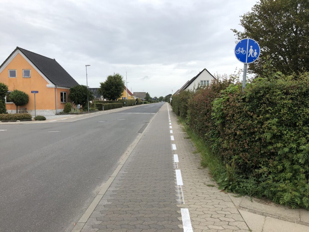 Farvekontrasten i SF-stenene var ikke nok til at vise den delte sti, så derfor har kommunen valgt at afmærke en midterlinjer med dimensionen 1-1-0,1 m. Det har så måske hjulpet på synligheden og måske forståelsen men er ikke korrekt. Linjen burde have været fuldt optrukket.