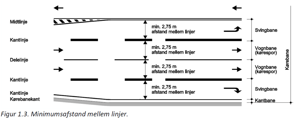 Først til det vigtigste. Hvor bred skal en svingbane egentlig være? Den skal i hvert fald være minimum 2,75 meter mellem linjer, som beskrevet i håndbogen om Længdeafmærkning, hvor denne figur er præsenteret.